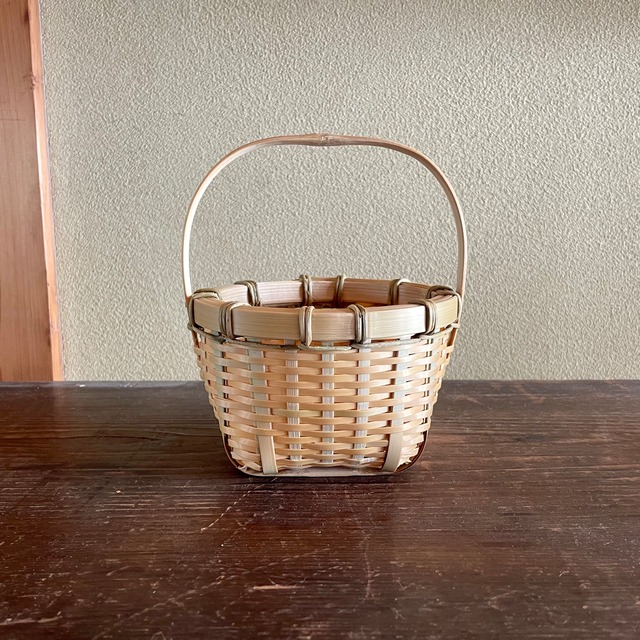両手に収まるミニサイズの手つきかご。次男の誕生日プレゼントとして制作した籠です。 小さなお花や観葉植物を入れるのにぴったりなサイズ感です。 お子様やお孫さんへのプレゼントにもおすすめです。 ーーーーーーーーーー 直径 約13cm 高さ 約9cm(持ち手含む高さ約15cm) 材質 真竹、オオツヅラフジ ーーーーーーーーーー ・ご注文後1〜2日程度で発送いたします。 ・写真は12月現在の現品を撮影したものです。作りたての青い状態のものをご購入希望の方は下記メールにてご連絡ください。受注生産にて承ります。 ・現品売り切れの場合、受注生産にてご注文承ります。サイズ違いやオーダーメイドのご相談も可能です。メールにてお問い合わせください。 ・青竹は水分量が多いため、長くしまっておいたり風通しの悪いところに置いておいたりすると、カビが発生する可能性があります。特に高温多湿の季節は注意が必要です。カビは籠の底面や内側、持ち手や縁の止めになどに使用するオオツヅラフジに発生しやすくなっています。カビが発生した場合は濡れ雑巾などで丁寧に拭き取り、風通しの良いところで陰干し乾燥させてください。 ・竹は自然素材のため、折れや割れが発生する場合もあります。その際はお気軽にご相談ください。 ・小売店様など当工房の商品の取り扱いをご希望の方は下記メールにてお問い合わせください。 ・転売を目的としたご購入は固くお断りいたします。転売行為が確認された場合、今後のご注文をお断りする場合がございます。何卒ご理解とご協力をお願い申し上げます。 【お問い合わせ】 竹桐舎 [email protected]