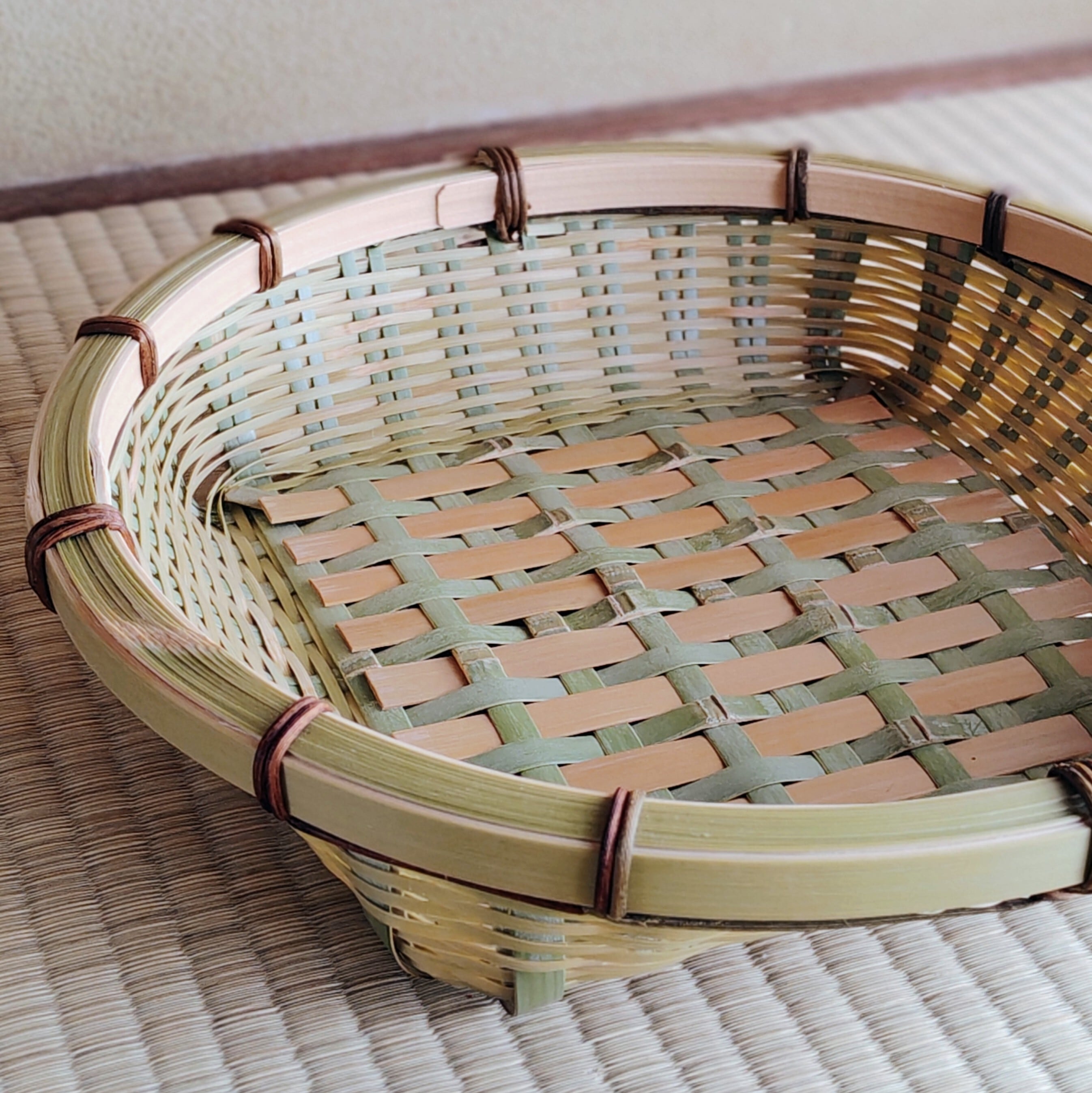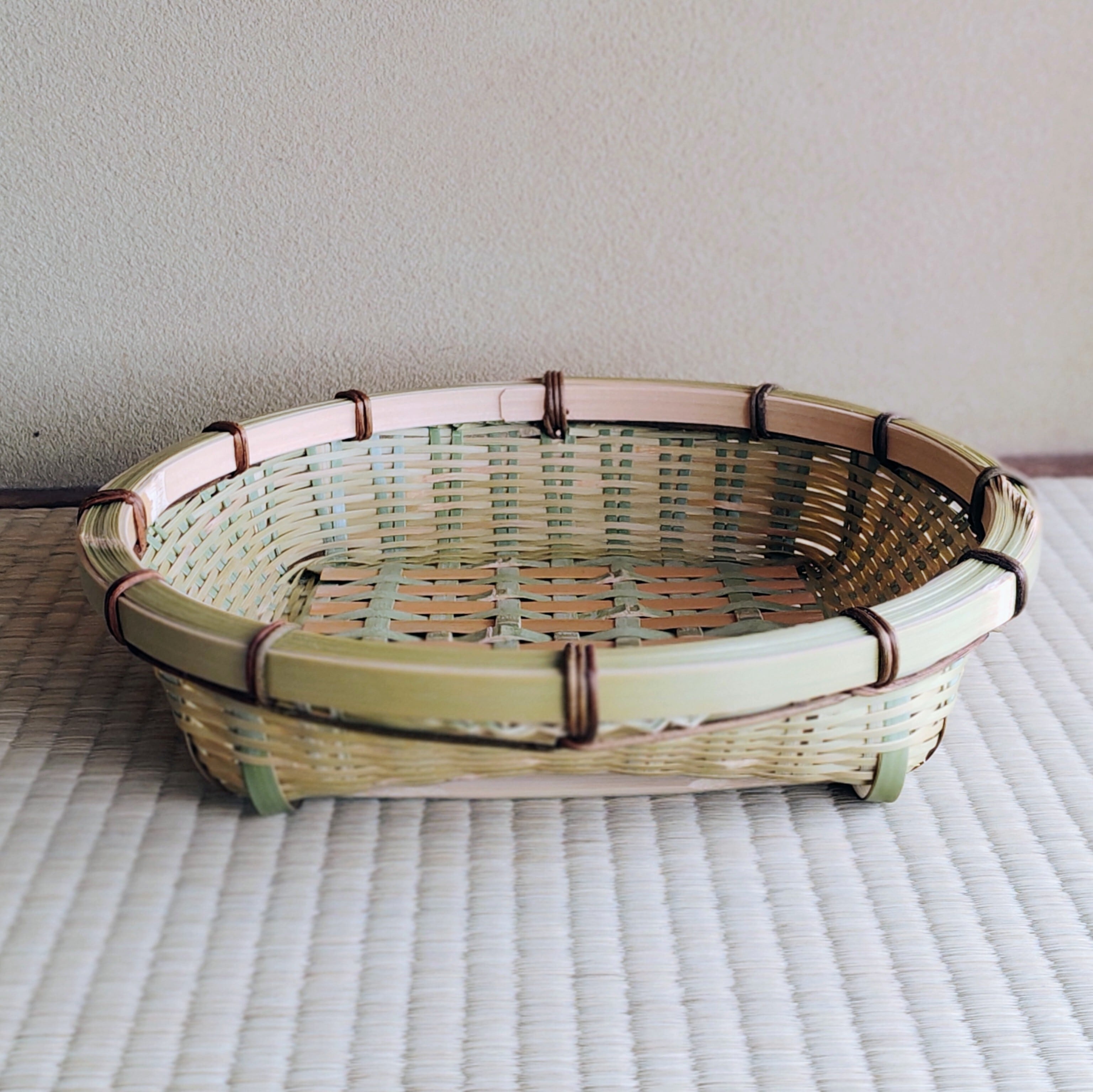 ・青竹は水分量が多いため、長くしまっておいたり風通しの悪いところに置いておいたりすると、カビが発生する可能性があります。特に高温多湿の季節は注意が必要です。カビは籠の底面や内側、持ち手や縁の止めになどに使用するオオツヅラフジに発生しやすくなっています。カビが発生した場合は濡れ雑巾などで丁寧に拭き取り、風通しの良いところで陰干し乾燥させてください。